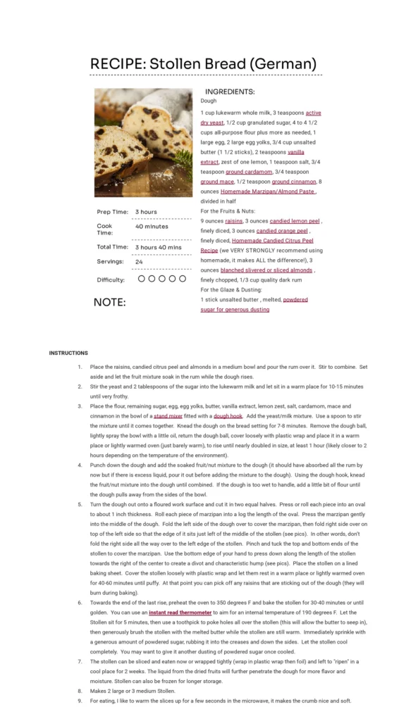 The butter ban was once an for all lifted during the Protestant Reformation of the 16th century. From that point the stollen gradually developed into an enjoyable sweet bread incorporating additional ingredients and it become an important symbol of the region. King August II in 1730 commissioned the bakers of Dresden to bake a gigantic stollen in celebration of the strength of the Saxon military, an event to which he invited the dignitaries of Europe in the hope of building allies. The stollen weighed 1.8 tons (that’s 3600 pounds!), was 27 feet long and 18 feet wide and a special oven was designed and built just for this purpose. It took a convoy of eight horses to transport the stollen to the king’s table and a 26 pound and 5 1/4 foot-long knife was used to cut it.